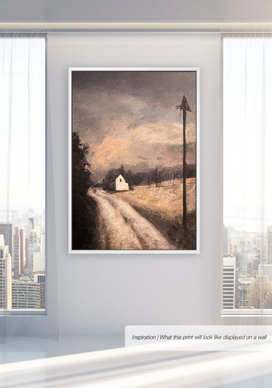 A country road winds past an ancient telephone pole, its weathered essence murmuring tales of bygone years. Along its path, it passes the hush of the countryside's quietude. Beneath a dramatic sky painted in hues of a tranquil evening, it bathes a haven—a peaceful retreat from the noise of the world, life's serenity in its quieter moments.