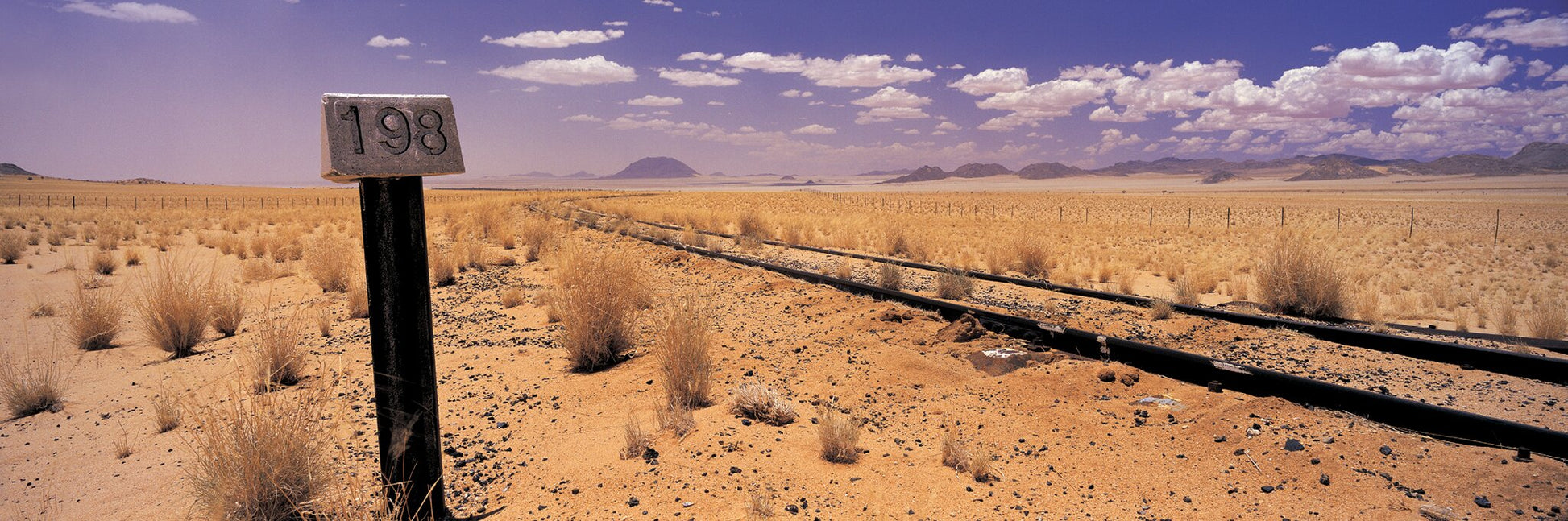 A classic photograph shot of a sign planted alongside a railway line in the desert.