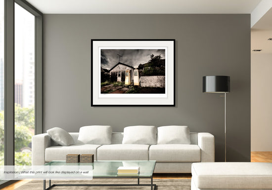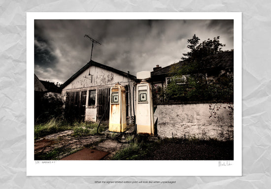 One of the most popular prints in the abandoned collection, this limited edition print was photographed in Ullapool, Scotland. An unusual scene with two petrol pumps that look like King and Queen chess pieces stand defiant outside an old home on a main street in the village.