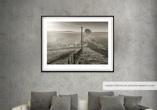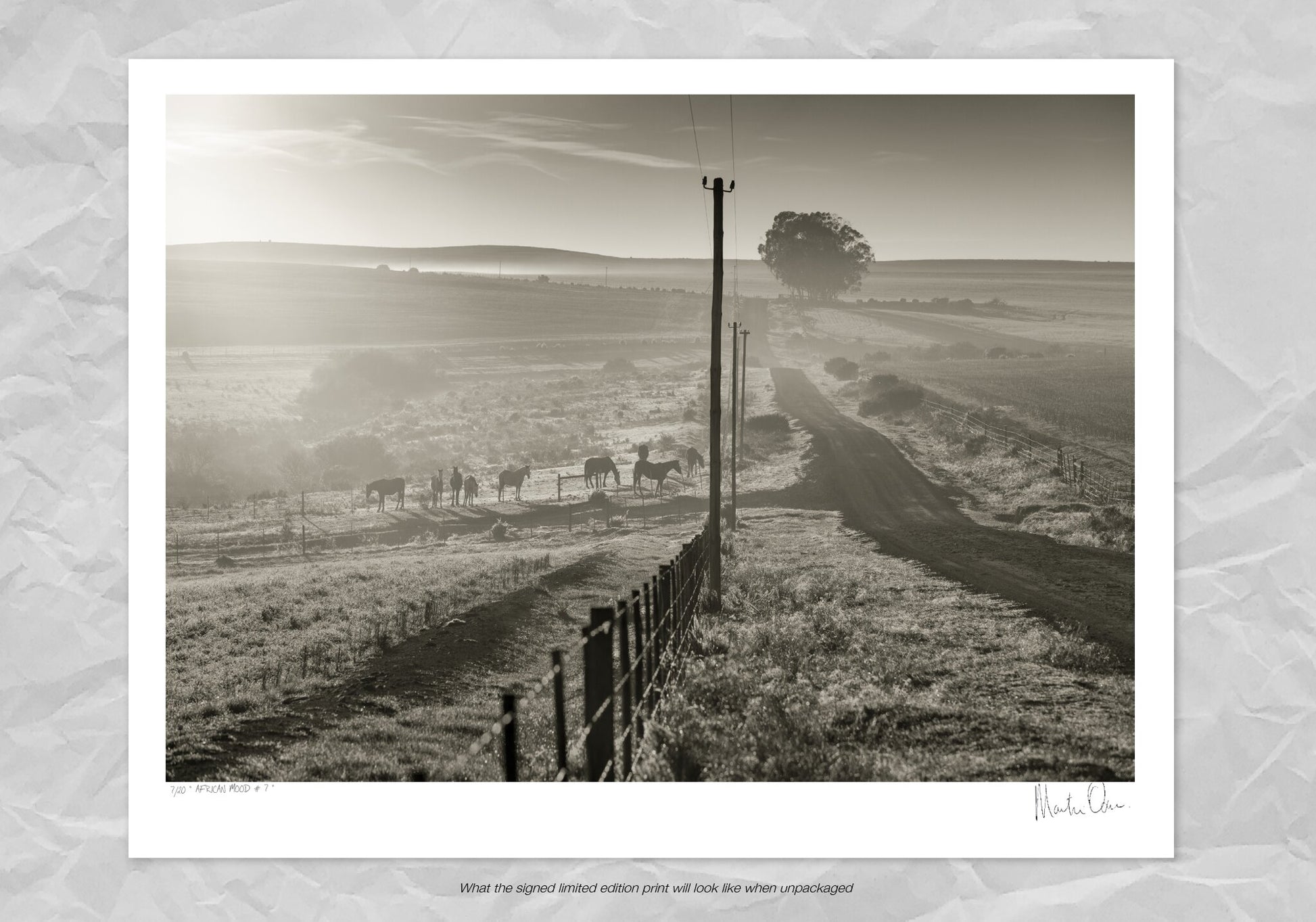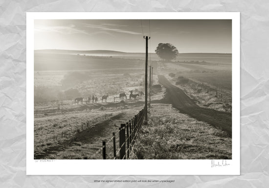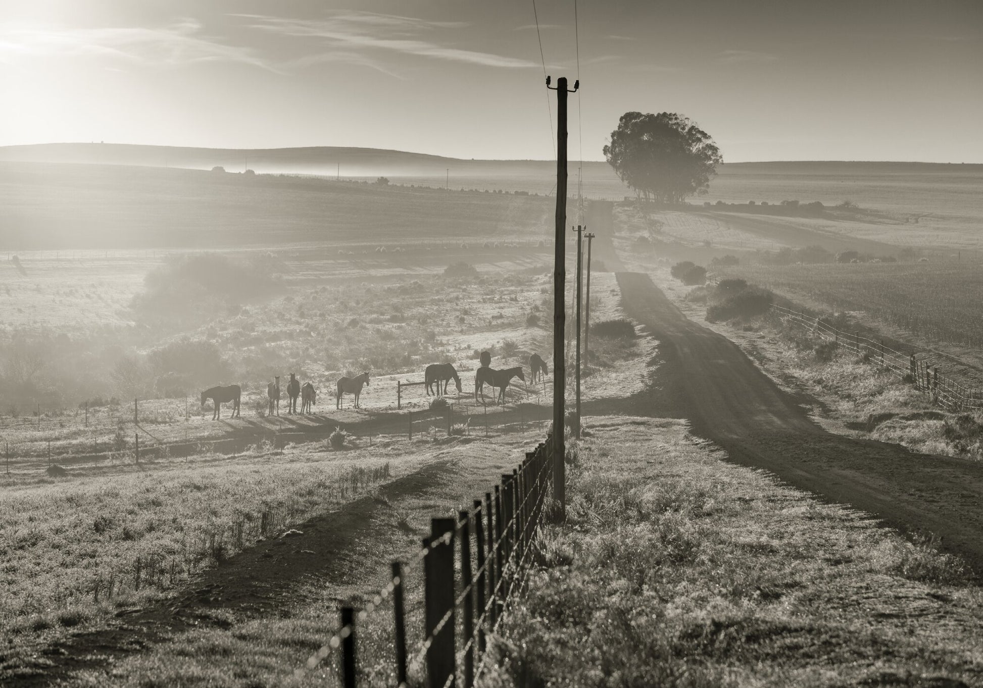 A misty morning on a dirt road out in the countryside. This black and white photograph with horses in the field captures the essence of an African rural landscape.
