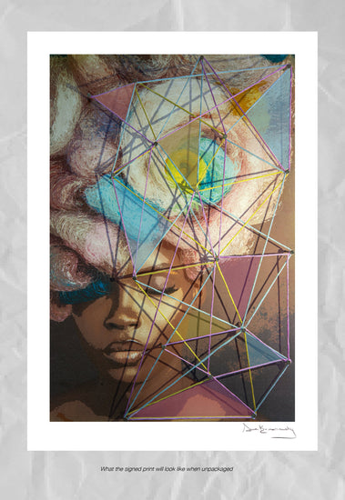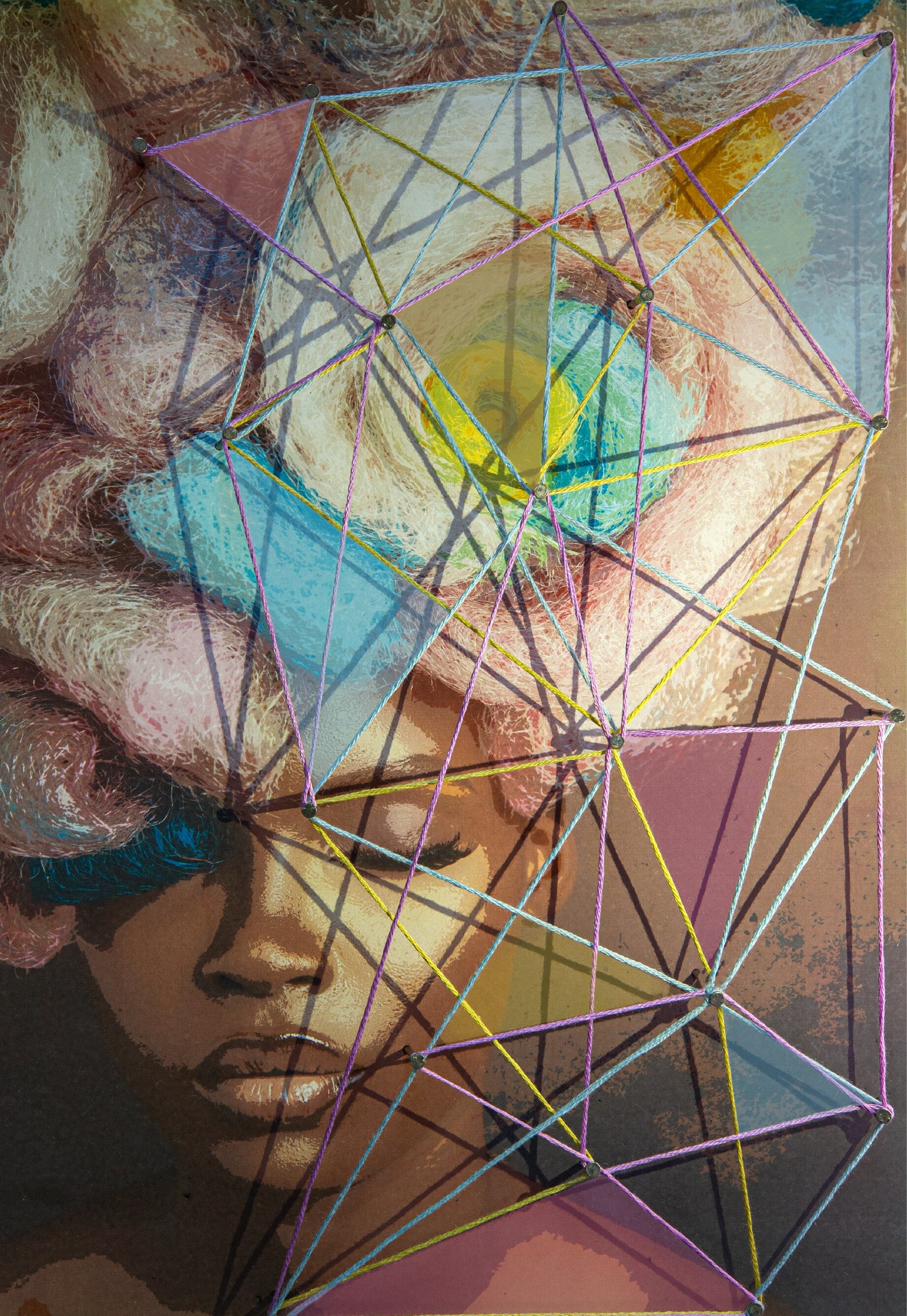 Created using a pop-art overlay and finished off using nails and thread as a graphic, elevated textured layer.