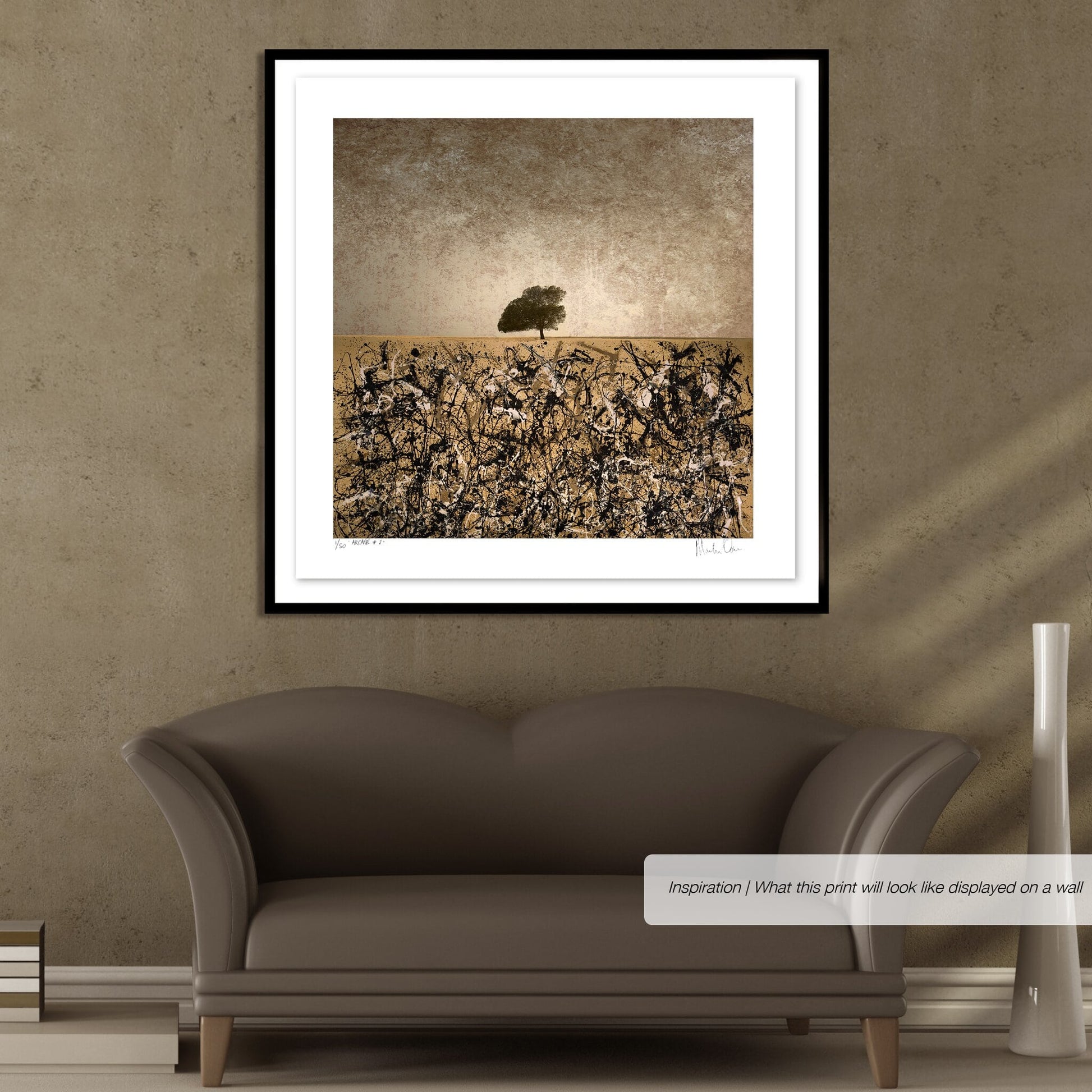 An incredible mixed media artwork of a solitary tree portrayed in an abstract world, inspired by the brilliant artist Jackson Pollock.