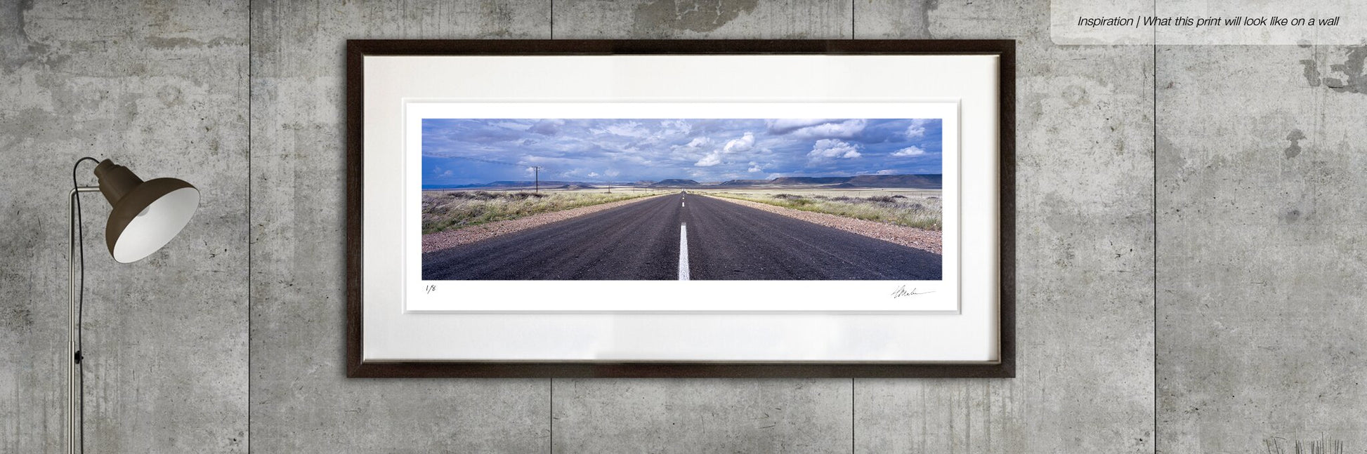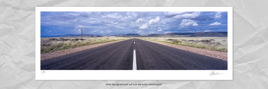 An impressive panoramic photograph of a straight road heading out into the vastness of Namibia. This breathtaking print by Hougaard Malan forms part of an extensive portfolio of limited edition photographs.