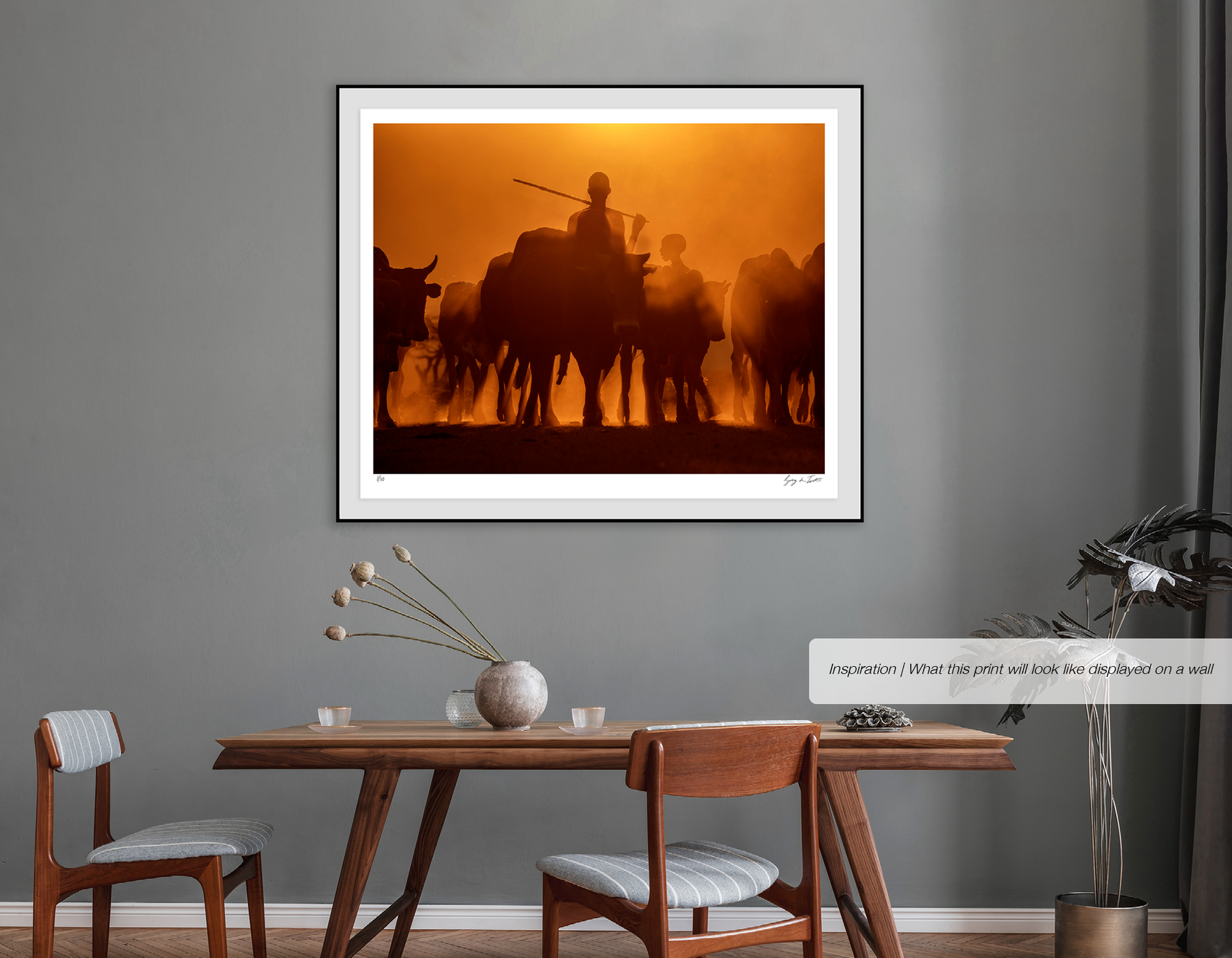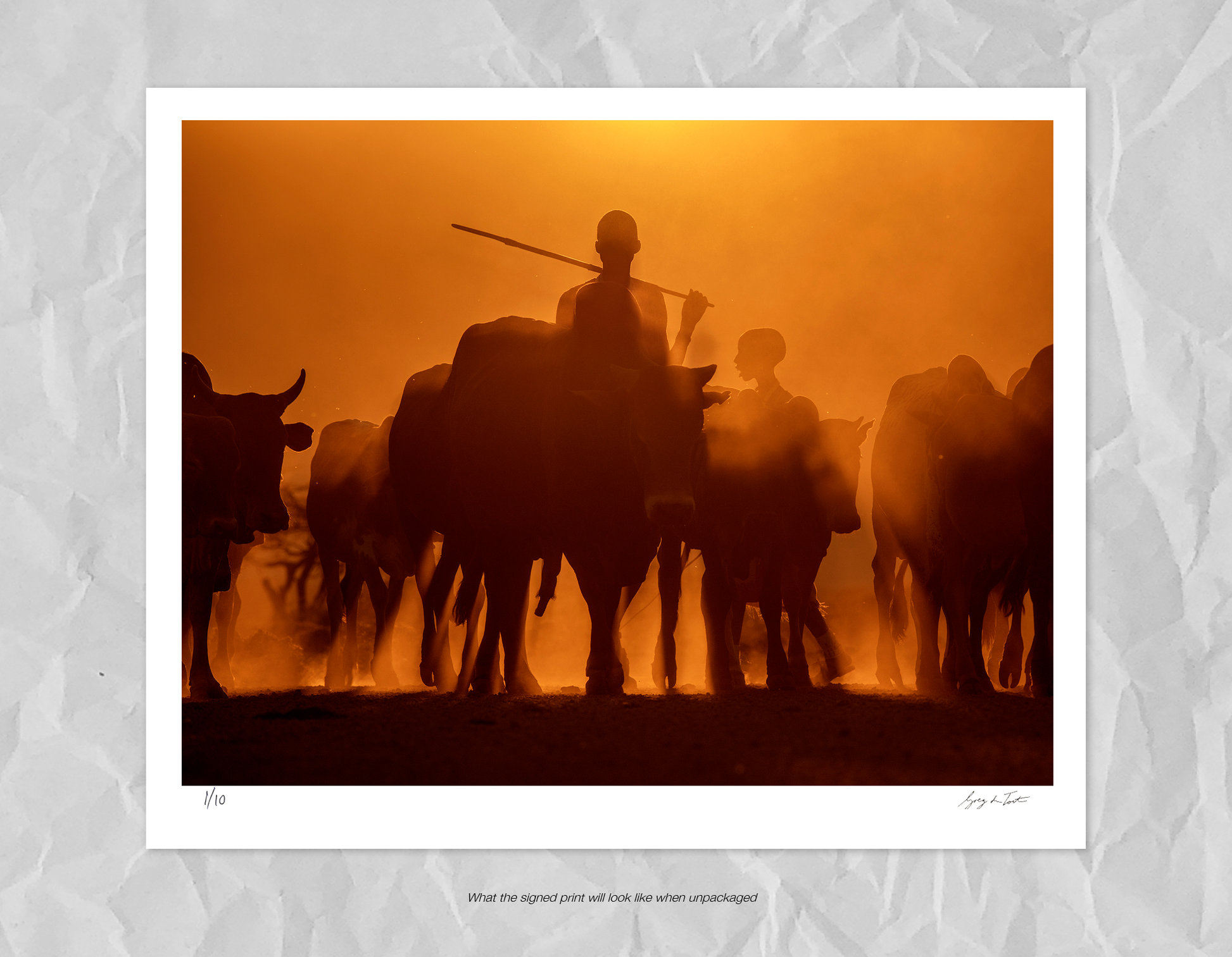 Silhouetted shepherds in the glowing light of the setting sun. In Kenya’s Rift Valley in a remote part of Maasai-land, when the cow herders get close to home, the village children come out to greet them and help them ferry the cows home. A dramatic and moody print by award-winning wildlife photographer Greg du Toit.