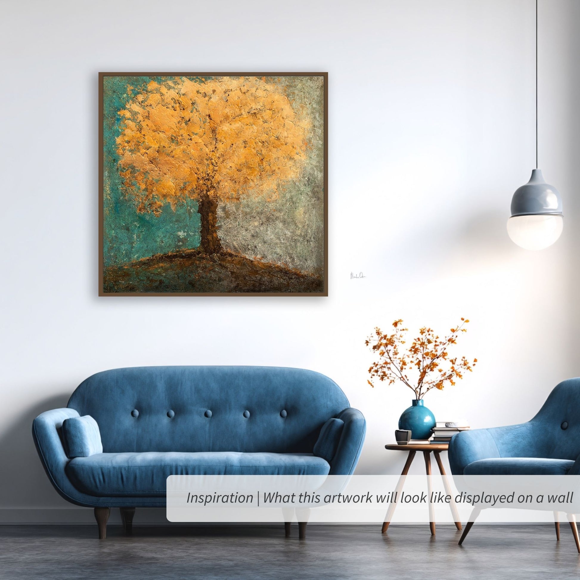 This textured tree draws on the story of Eden and the moment of choosing the knowledge of good and evil. The golden canopy stands between a cooler green on the left and a lighter glow on the right — both equally inviting, offering no clear direction. Through layered earth tones and subtle shifts in colour, the piece reflects the tension of discernment, where beauty lies on both sides yet the weight of the choice remains unseen.