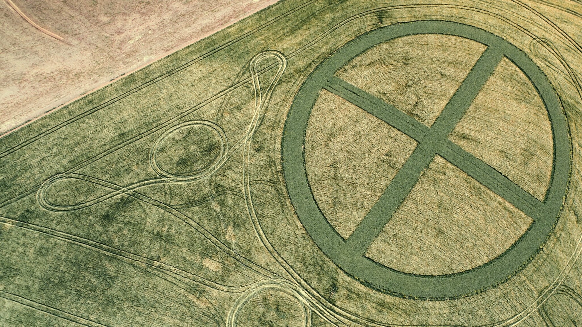 A farmer plants crops in an interesting shape enhanced by the colours of the harvest.