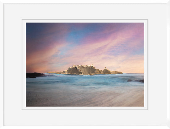 The iconic shape of Table Mountain is beautifully rendered in 18-karat gold plate, capturing its majestic presence as seen from across Table Bay at Blouberg. This golden depiction of the mountain stands out against a tranquil seascape, where the ocean is portrayed in soft tones of turquoise, cyan, and aqua-blue. The gentle movement of the waves is delicately illustrated as they break onto the beach, adding a sense of calm and serenity to the scene. The sky is portrayed in pastel tones, enhancing the peaceful ambience of a calm summer's day just after sunset, which evokes a sense of timeless beauty and serenity.