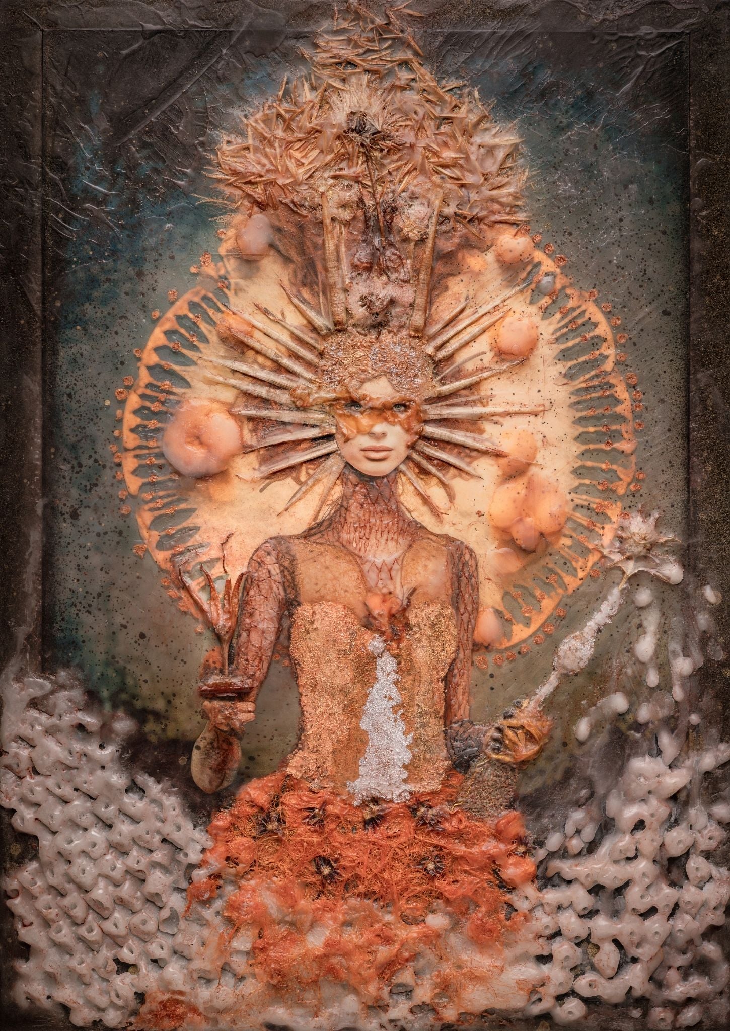 Part III of the of the Limited Edition Introductory Trilogy for the Envisioned Luminous Echoes series In Emergent, the Oracle reappears transformed yet whole. Light replaces fracture, breath becomes texture, and sound seems to echo through the surface. Wax, botanicals and pigment merge as open expressions rather than concealment, revealing resilience through soft embodiment. As the final piece in the trilogy, Emergent reflects on renewal, perception and the quiet strength found in transformation. Dandelions rise again, delicate yet tenacious, holding space for memory and change. Though rooted in digital creation, the work evolves through tangible processes of fire, wax and time, finding harmony between technology and the living world.