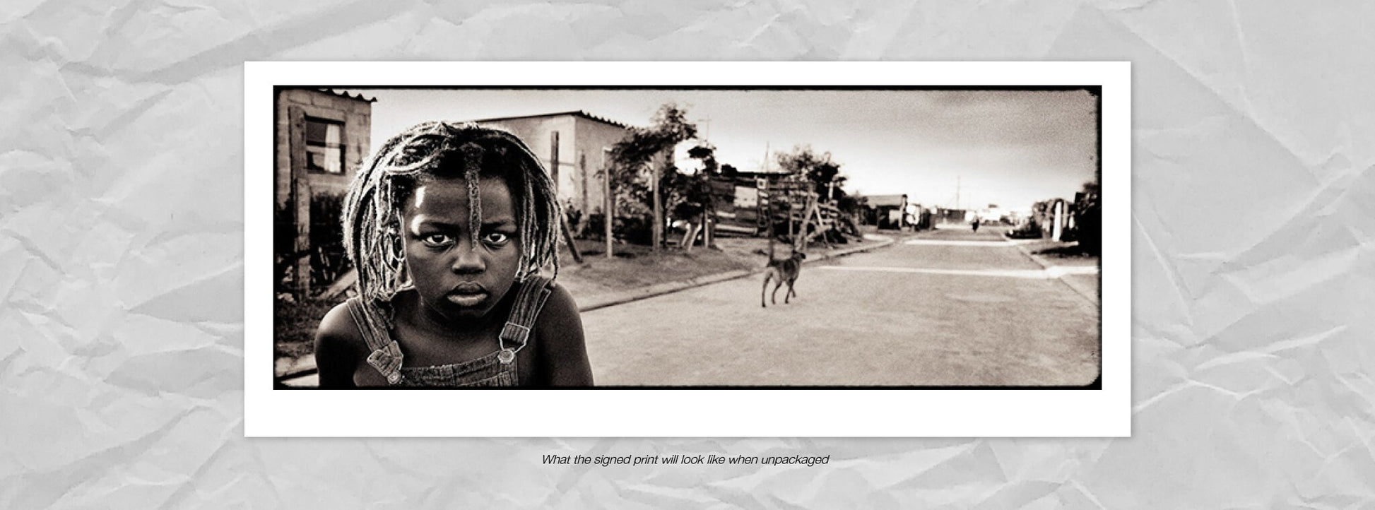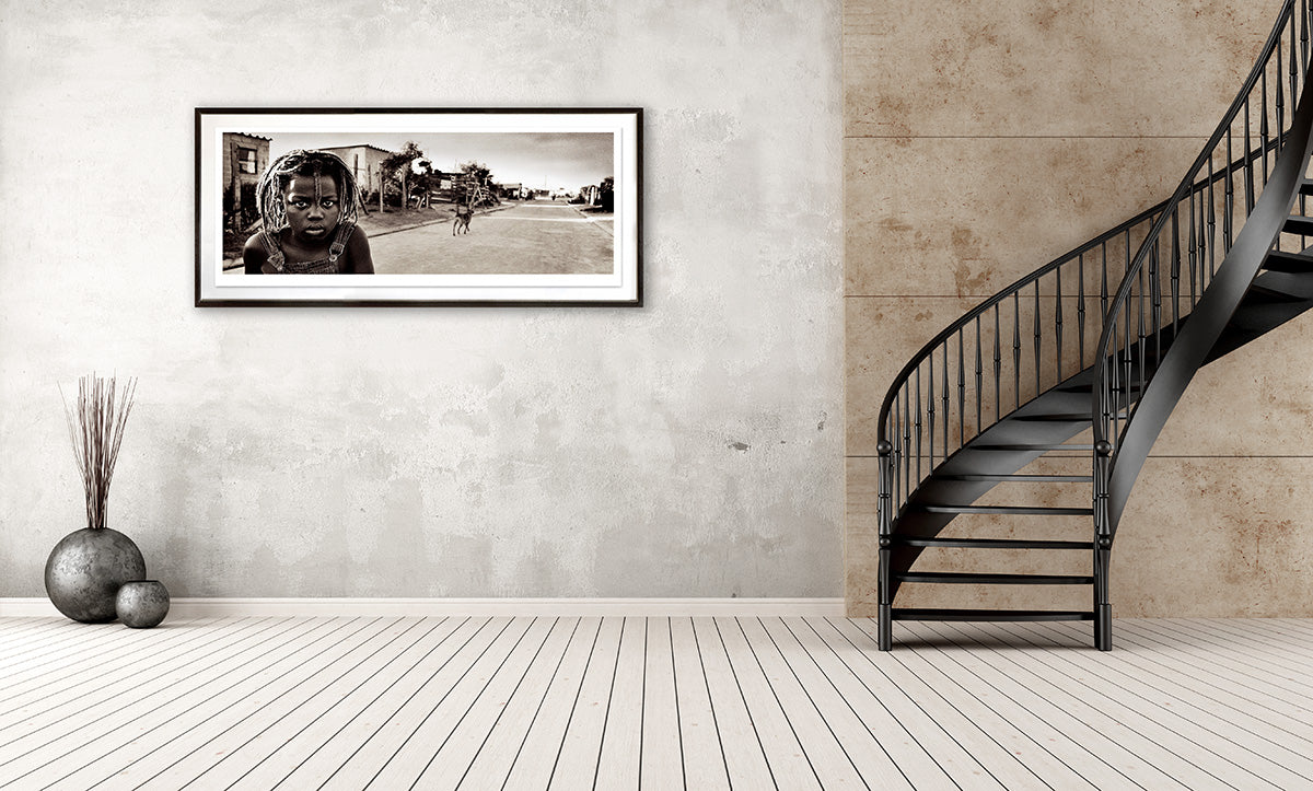 A popular black and white litho print photograph of a young boy in a township in Cape Town by Antti Viitala.