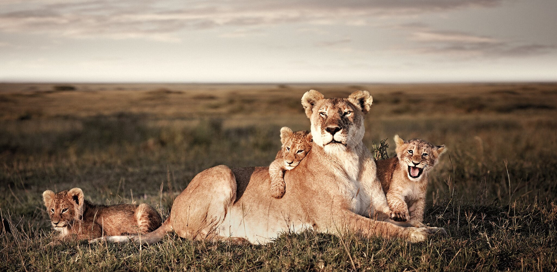 An incredible wildlife photograph capturing the moment! A proud lioness with three of her cubs, each with their own personality. The cheekiness of the one cub is just priceless.