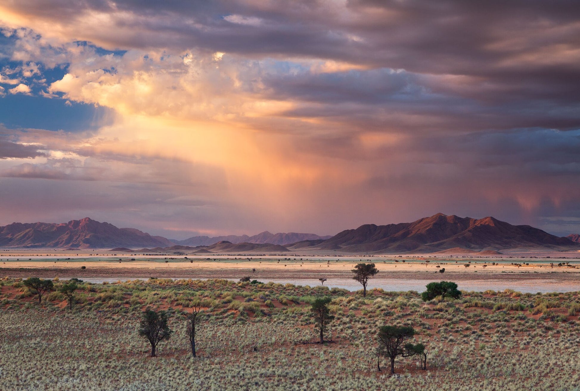 The last light of the day paints an incredible sky over the simplistic landscape of the Namib Rand.